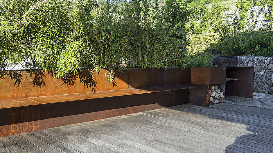 Der Kunde trat genau mit diesem Wunsch an uns heran: Schaffen von Privatsphäre mit der Kombination einer Sitzgelegenheit und dem Integrieren des rege genutzten BBQ-Bereichs.