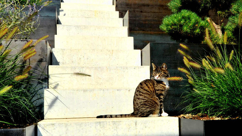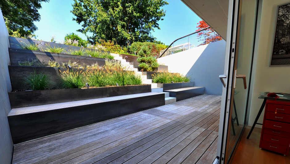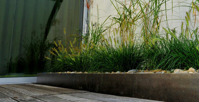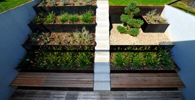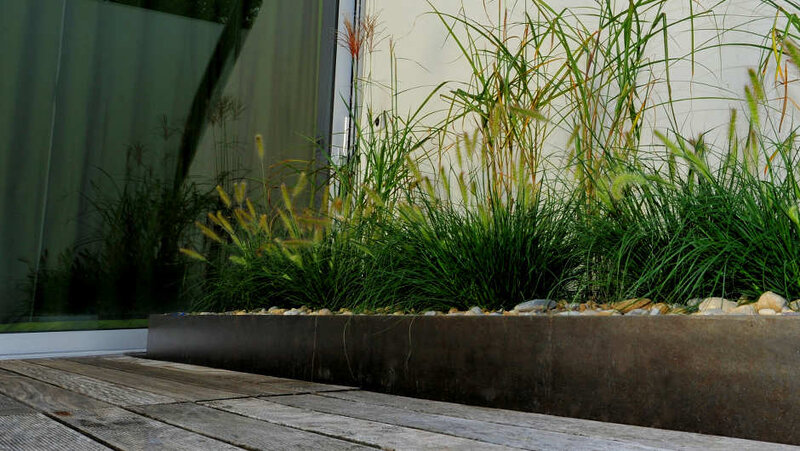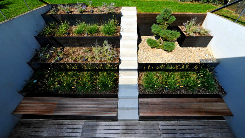 Unser Kunde trat genau mit diesem Thema an uns heran. Die Rutschbahn an der Böschung verband den Gartenbereich mit dem Atrium. Von den Kinderzimmern gelangt man direkt in das Atrium. Das neue Jugend-Konzept beinhaltet eine Terrassierung der Böschung mit Hochbeeten aus Stahl. Um die Beete zu bewirtschaften und Zugang vom Garten zu ermöglichen, wurde mittig eine Treppe eingesetzt. Des Weiteren bietet am unteren Ende im Atrium eine Sitzbank mit Lärchenrost Platz zum Relaxen. Die Hochbeete wurden im Schwarzblech-Look erstellt und konserviert. Sie nehmen die moderne Architektur des Wohnhauses auf.