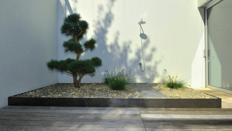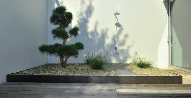 In einer zweiten Phase kam das gegenüber liegende Atrium hinzu, welches von weiteren Zimmern im Untergeschoss zugänglich ist. Hier wurde die bestehende Aussendusche ins neue Konzept aufgenommen. Dieser Bereich wurde mit einigen niedrigen Beeten und einem schönen Solitär neu ausgestattet.