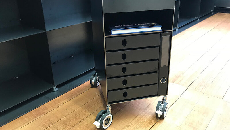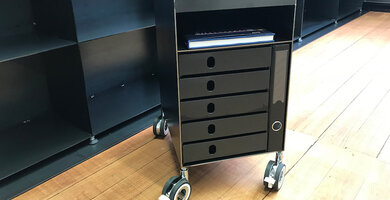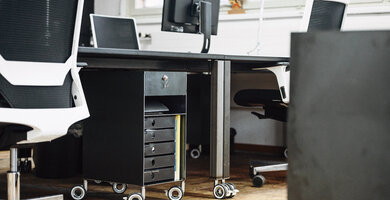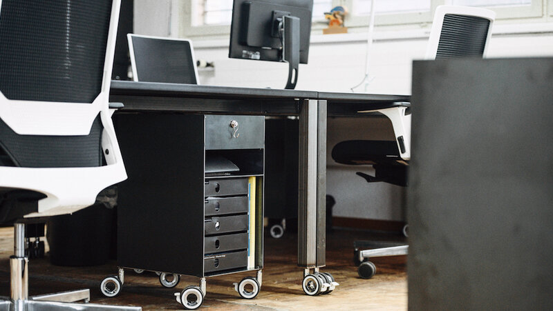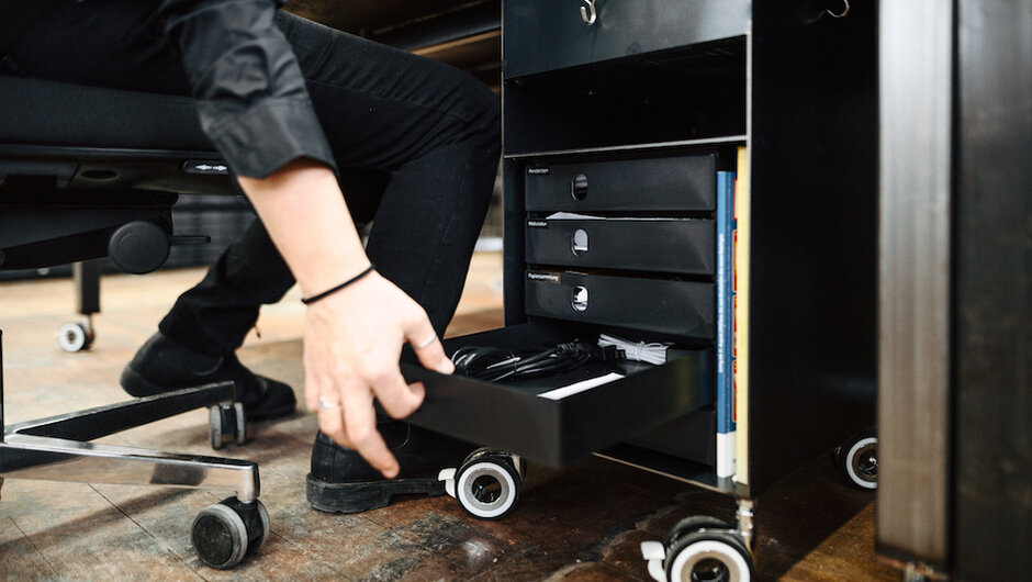 Ein Werkzeugkasten für unter den Schreibtisch, mit Platz für ein Schubladenelement, einen Ordner, Ihren Laptop und die üblichen Werkzeuge, wie Schreibmaterialien, Locher, etc. - alles griffbereit und gut organisiert. Rollbarer Stauraum für die wichtigsten digitalen und analogen Werkzeuge, auf bremsbaren Designrollen.